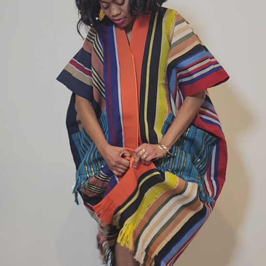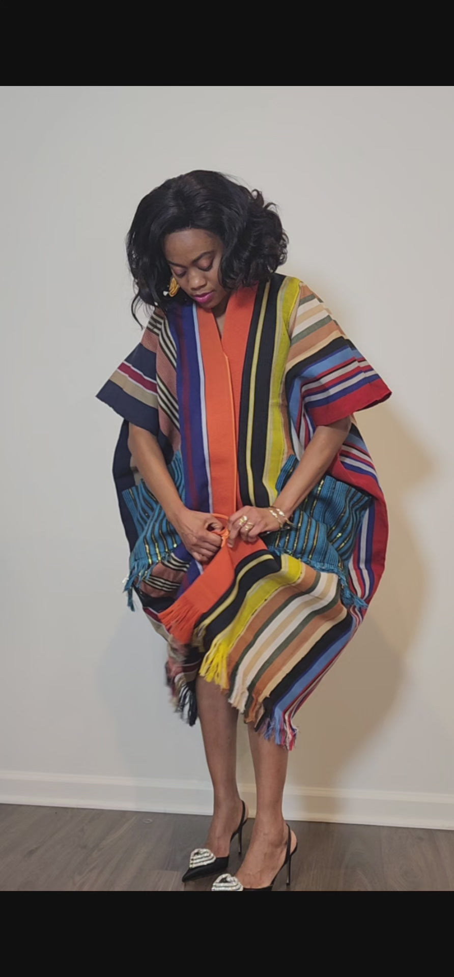 Step into undeniable presence with the Adéọba Regal Kimono Dress, a bold aso-oke statement piece crafted from richly woven premium heritage aso-oke and designed to command attention. Featuring striking multi-stripe paneling in vibrant jewel tones—orange, navy, gold, teal, and red—this design delivers effortless luxury through a dramatic, free-flowing silhouette.