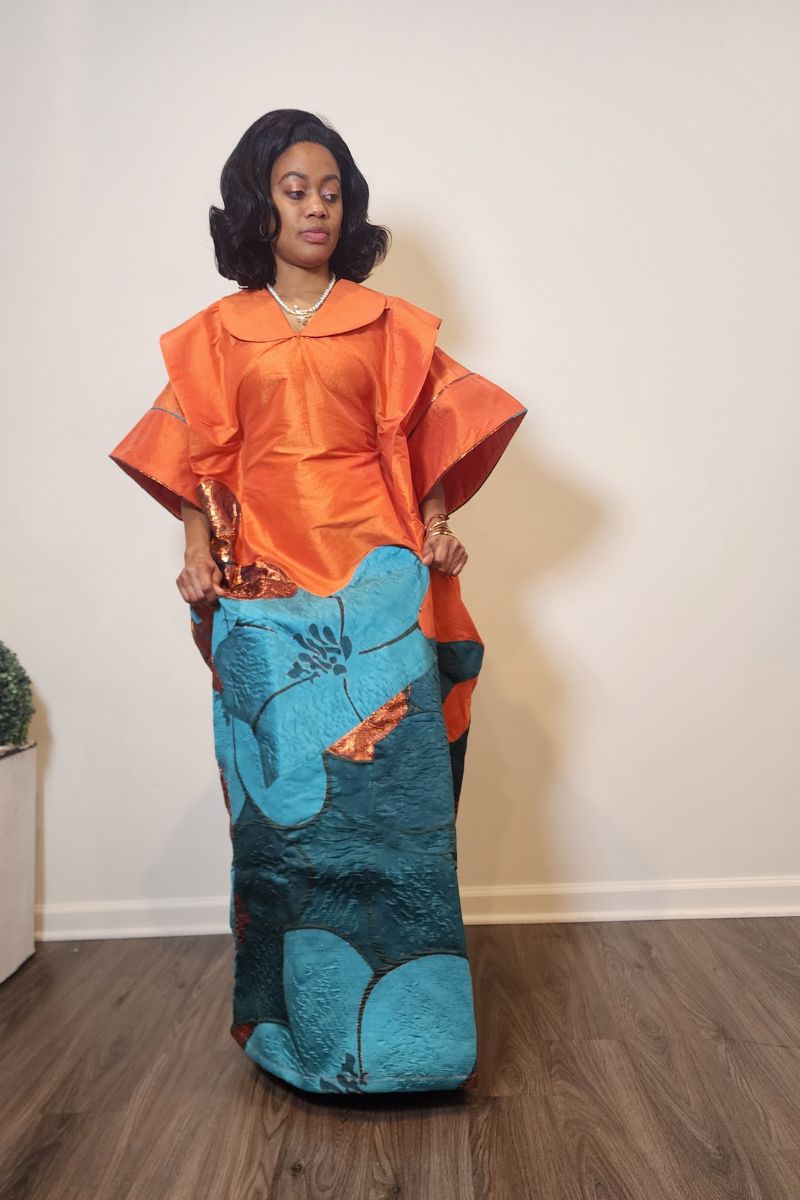 Crafted from premium soft taffeta, the Orekelewa Luxe Boubou is a celebration of timeless elegance infused with contemporary sophistication. Adorned with a rich damask pattern, this statement piece exudes regal charm and refined luxury. Its structured yet fluid drape creates a graceful silhouette that commands attention while remaining effortlessly modest.